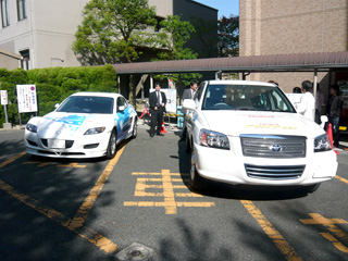 なお講演会終了後には岩谷瓦斯株式会社様の協力を得て、今、話題の燃料電池自動車『トヨタ 新型FCHV』と『マツダ RX-8ハイドロジェンRE』の試乗会(同乗走行)ならびにパネル展示を実施しました。試乗会(同乗走行)には長蛇の列が出来、燃料電池自動車の走行音の静けさに多くの参加者から驚きの声が上がっておりました。当日は天気にも恵まれ講演会・試乗会とも盛会のうち終了いたしました。多数のご来場ありがとうございました。
